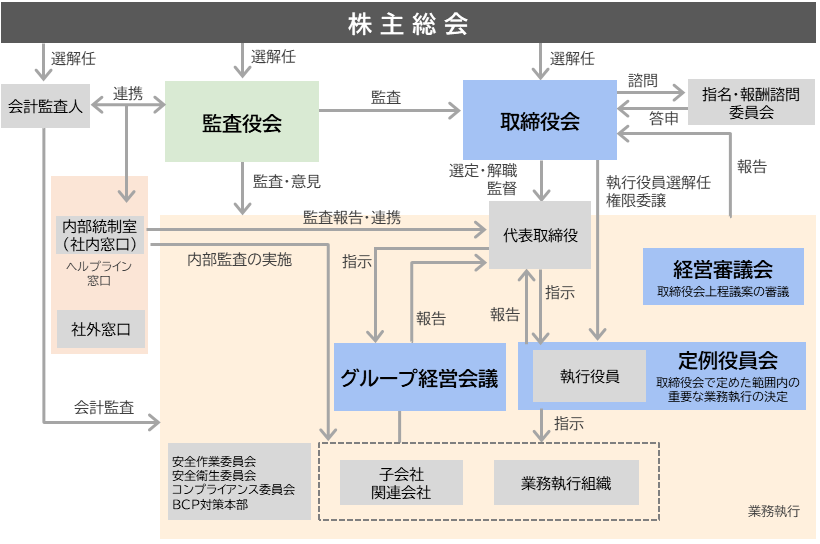 社外監査役を含む監査役機能の充実により経営の健全性の維持・強化を図り、取締役会においては社外取締役比率を高めることによりその監督機能を強化し、コーポレート・ガバナンス体制の充実を図っております。 また、業務執行に必要な責任者として執行役員を配置して一定の権限を委譲することで、業務に係る責任と役割を明確にするとともに業務執行体制の強化および機動的な意思決定を図っております。